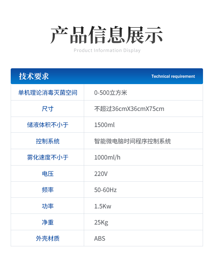 | 1、单机理论消毒灭菌空间:0-500立方米; | 2、尺寸:不超过36cmX36cmX75cm(长X宽X高,测量误差±5cm); | 3、储液体积不小于:1500ml; | 4、设备底部配有四个滑轮,设备可以轻松自由推动,方便移动; |