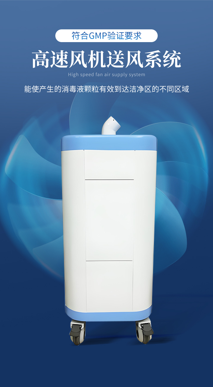 干雾过氧化氢灭菌技术依托低温汽化、低浓度药剂、超细干雾颗粒等核心优势,可实现对各类空间及表面的**消毒灭菌;其形成的3-5um过氧化氢微粒能做无规则布朗运动,渗透复杂区域,且微粒干燥不凝结,对彩钢板、环氧地面无腐蚀,*终产物为水和氧气,绿色环保,经美国环保署(EPA)认证,完全符合GMP验证要求,适用于食品药品车间、医院病房、交通工具等多场景灭菌。