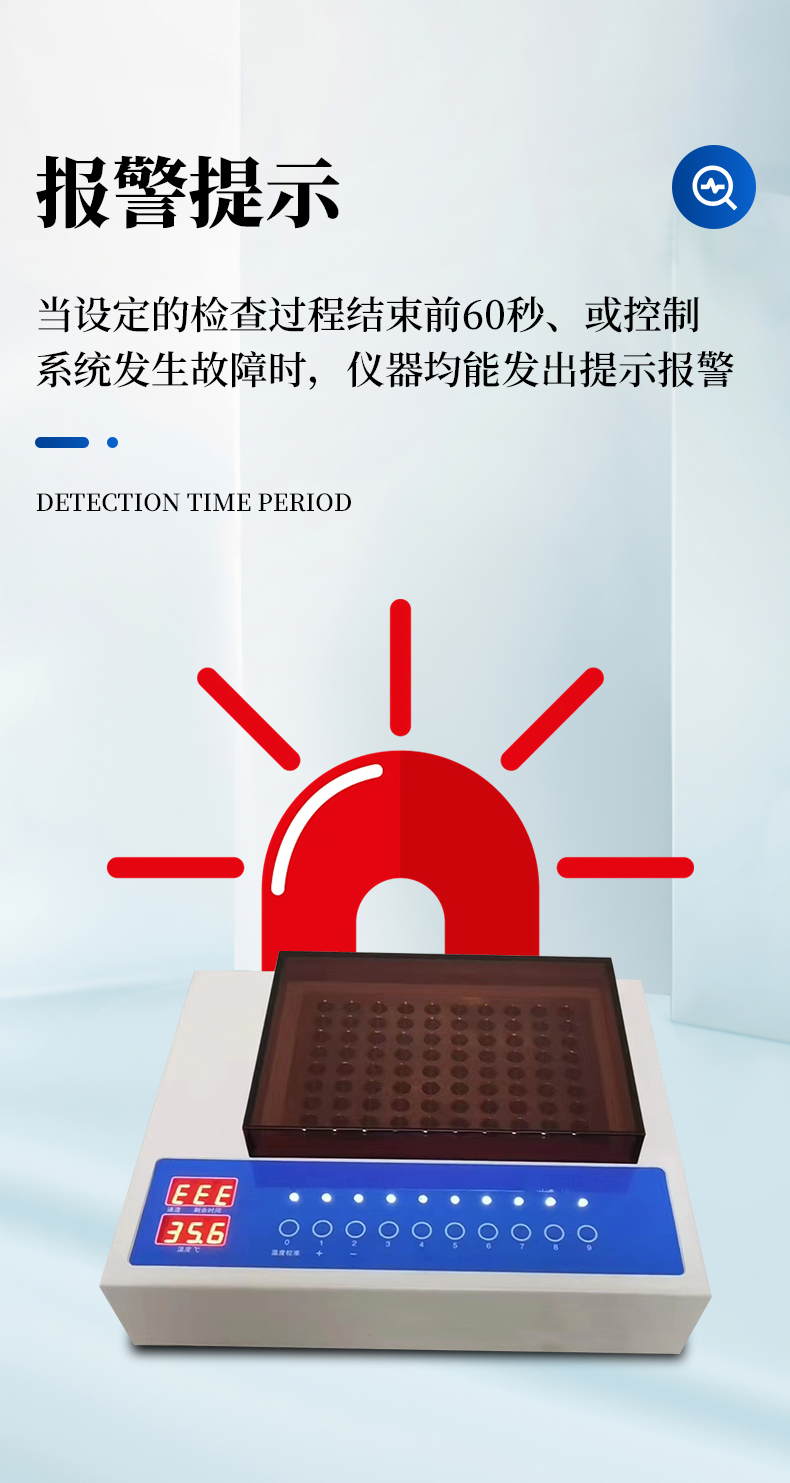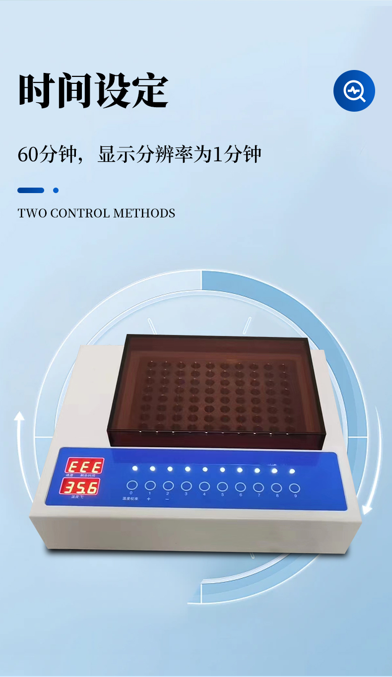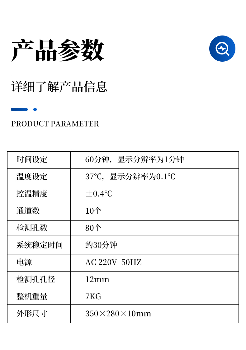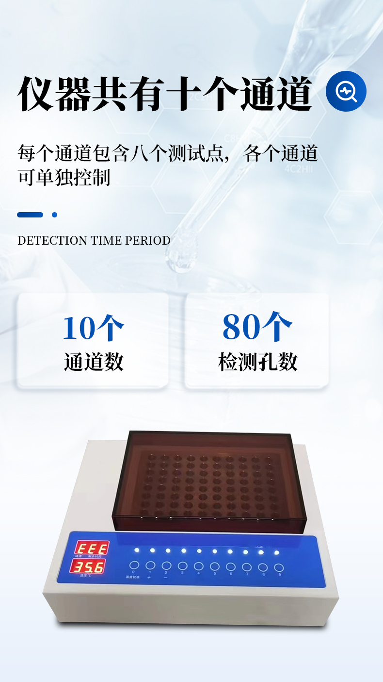 | 1、时间设定:60分钟,显示分辨率为1分钟; | 2、温度设定:37℃,显示分辨率为0.1℃; | 3、控温精度:±0.4℃; | 4、通道数:10个; |
