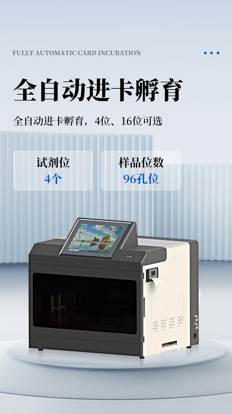 | 5、样品位数:96孔位; | 6、试剂位:4个; | 7、孵育位:全自动进卡孵育,4位、16位可选; | 8、温度设定范围:20-50℃范围可调; |