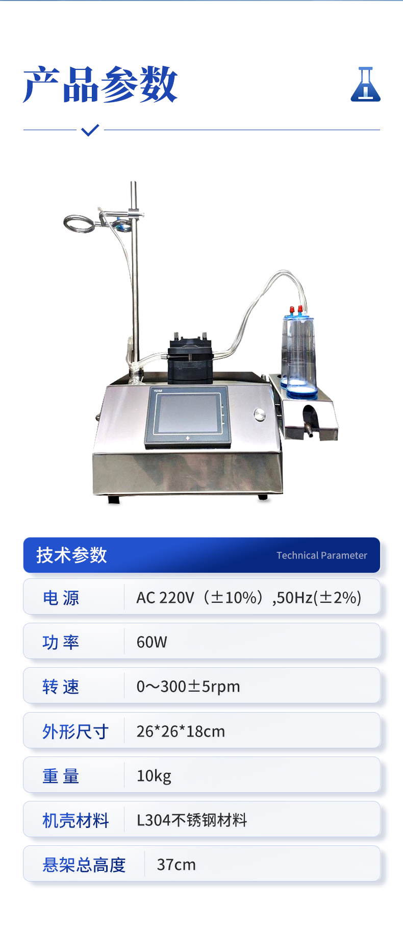 | 1、电源:AC 220V(±10%),50Hz(±2%); | 2、功率:60W; | 3、转速:0~300±5rpm; | 4、外形尺寸:26*26*18cm; |